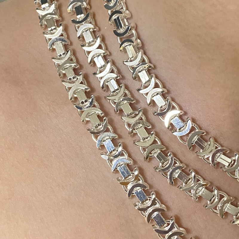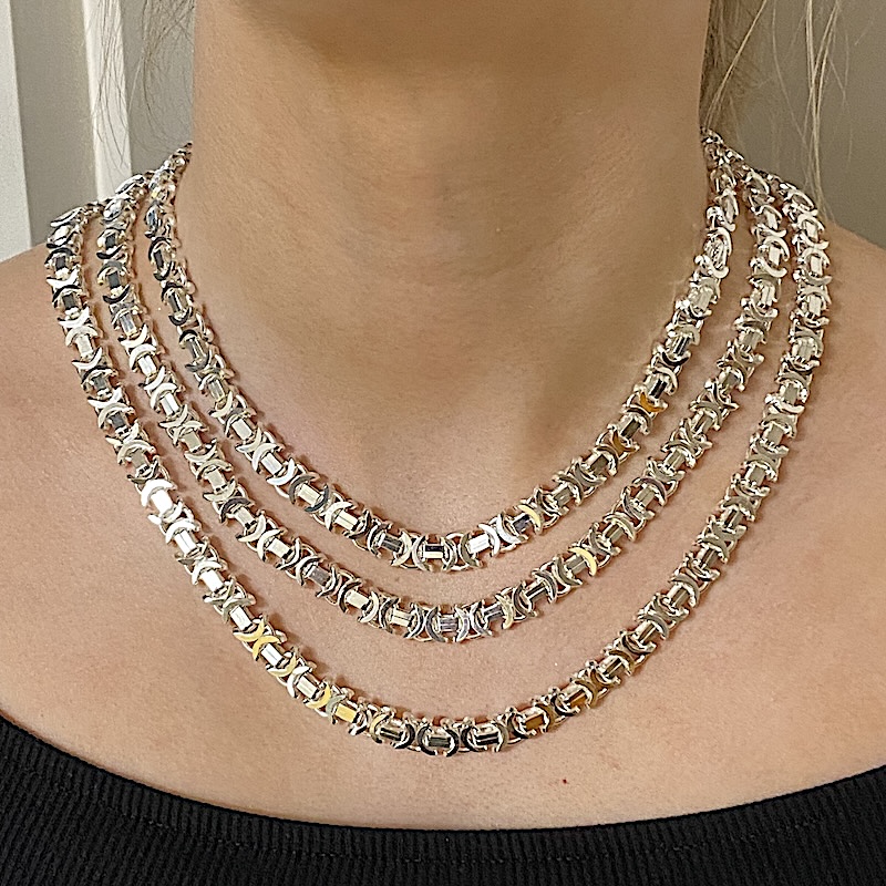 Silver Byzantine Bracelets And Chains. All Made From Solid 925 Sterling Silver. 7mm Wide. Two Bracelet Lengths To Choose From. 7.5 Inches ( Ladies Length ) Weighing On Average 28 Grams. 8.5 Inches ( Gents Length ) Weighing On Average 31.4 Grams. Three Chain Lengths To choose From. 20 Inches, Weighing On Average 76.4 Grams. 22 Inches, Weighing On Average 85.9 Grams., 24 Inches, Weighing On Average 93.5 Grams.