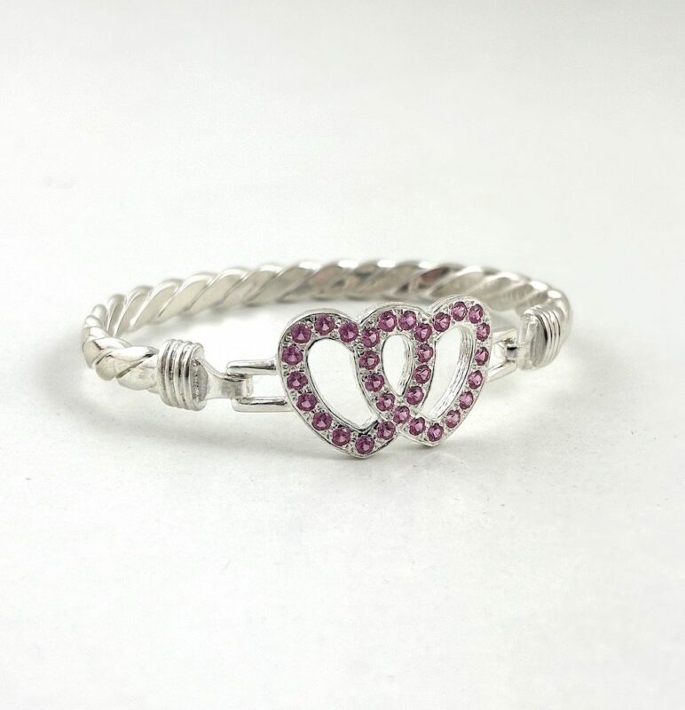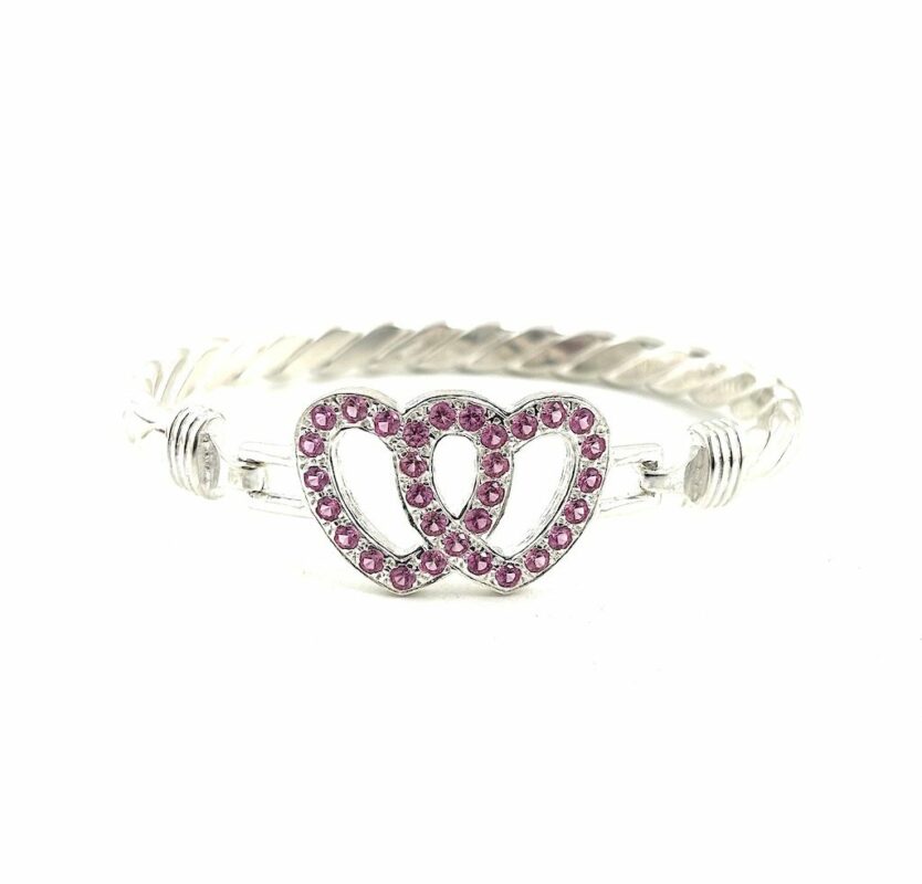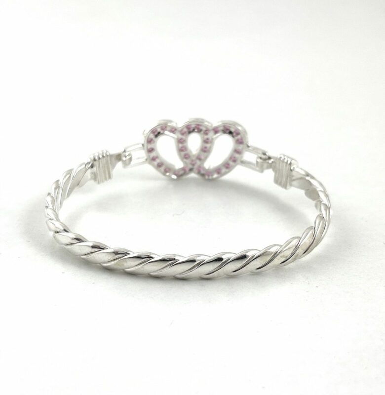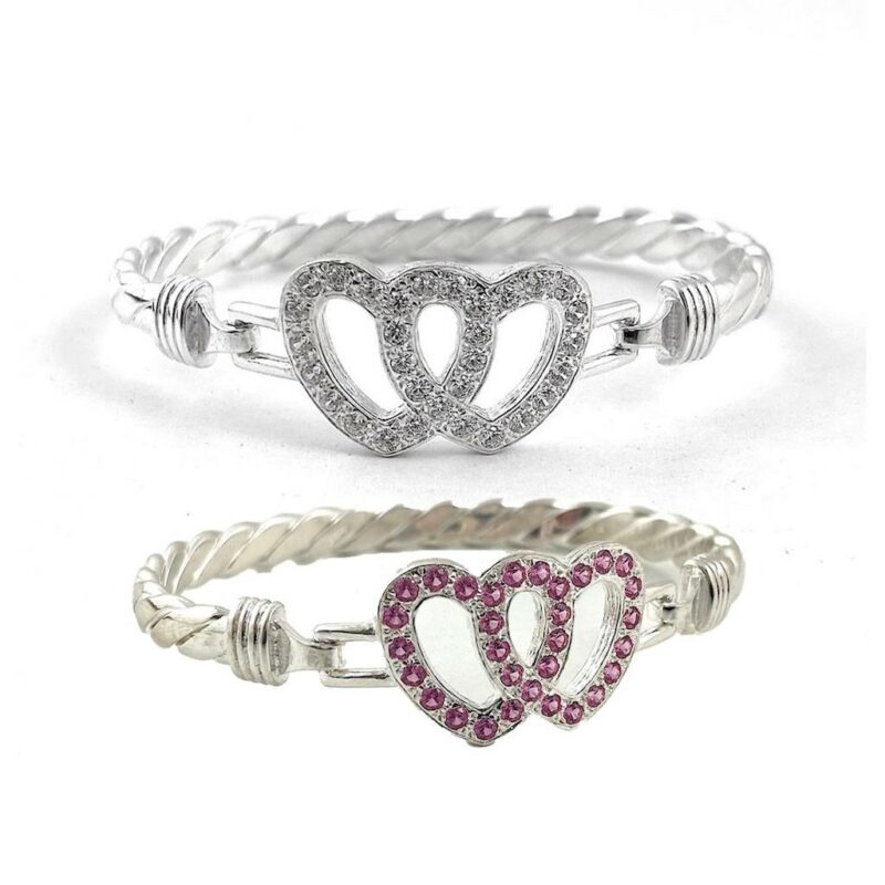Silver Double Love Heart Bangle. Made From Solid 925 Sterling Silver. Weighing On Average 25.3 Grams. With A Choice Of Either Pink Or White Stones. 7.5 Inch Circumference ( Standard Ladies Size ).