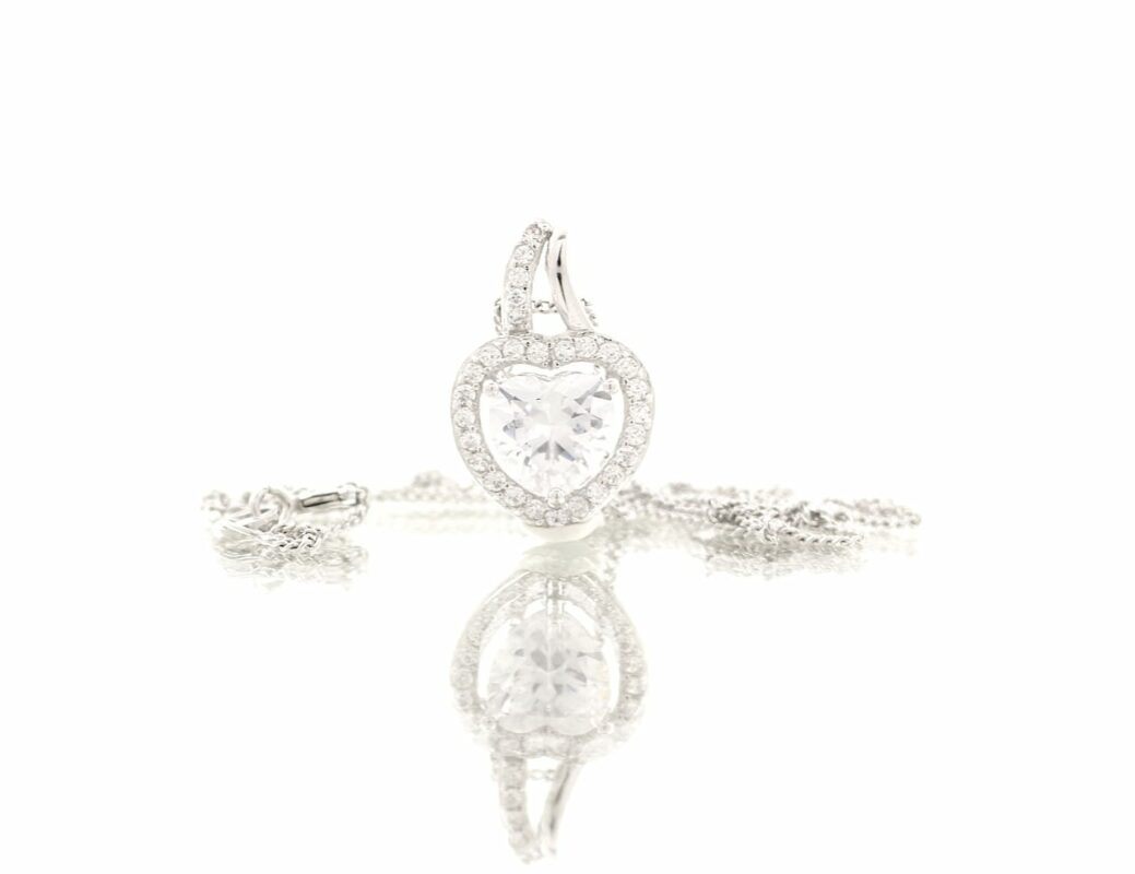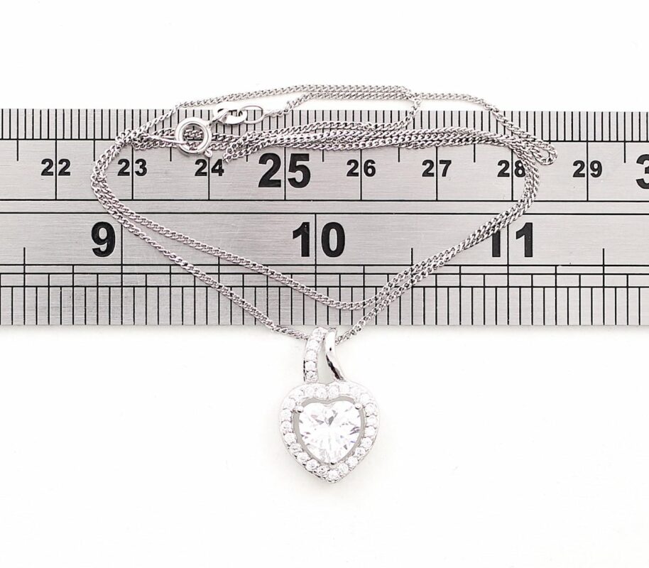 Silver Love Heart Halo Pendant With Silver Curb Chain. All Made From Solid 925 Sterling Silver. Set With Brilliant And Heart Cut CZ Stones. length Of Chain 18 Inches. Height Of Pendant 21mm, Width Of Pendant 19mm.