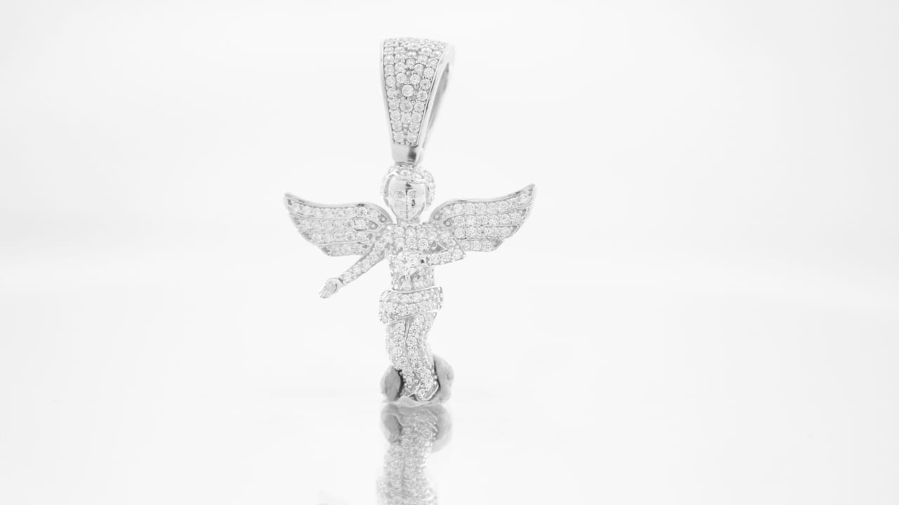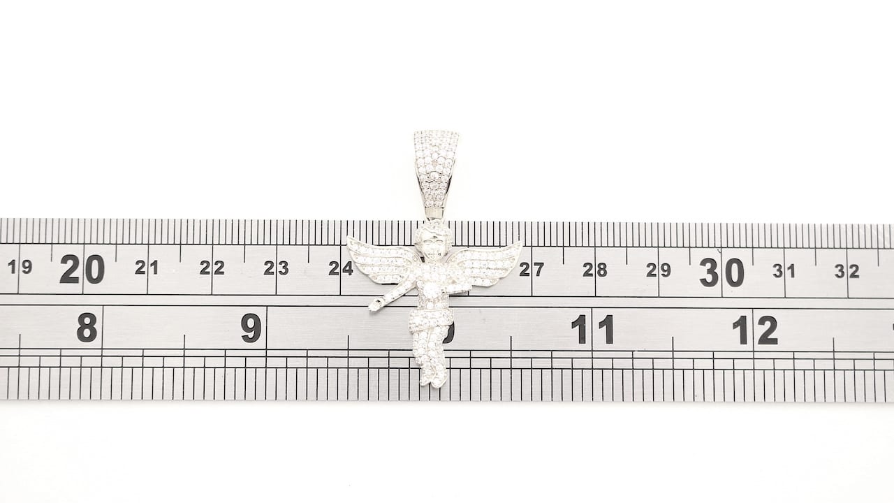 Solid Silver Angel Pendant With Silver Curb Chain. All Made From Solid 925 Sterling Silver. Pendant Set With Brilliant Cut CZ Stones. Height 38mm, Width 29mm. Chain Length 18 Inches.